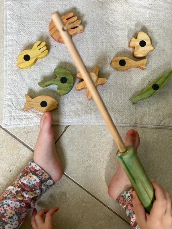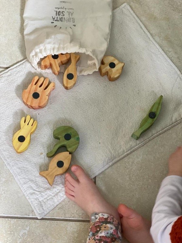En Madera de pino, pintado con tintes naturales y protegido con cera de abeja.